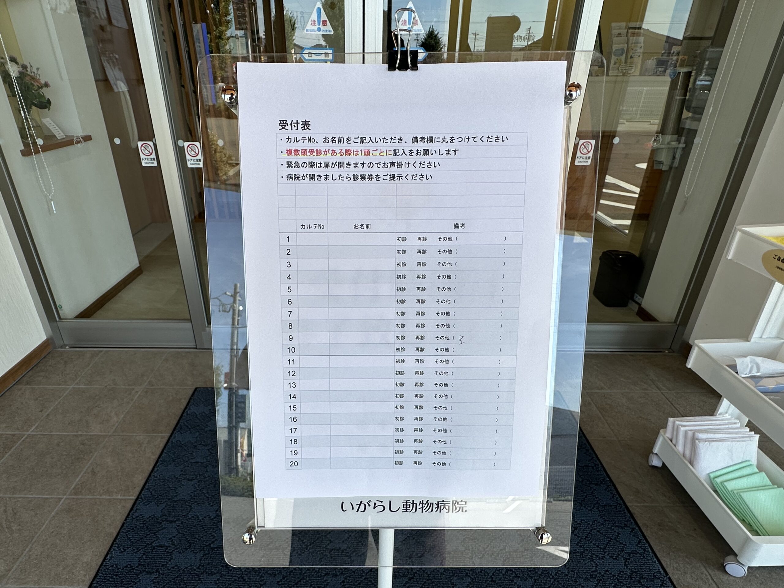 午前診察前は8時、午後診察前は15時に受付表を病院正面風除室内にご用意させていただきます。(写真参照)